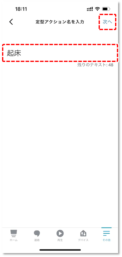 定型アクション名(例:起床)を入力して 次へ をタップします。